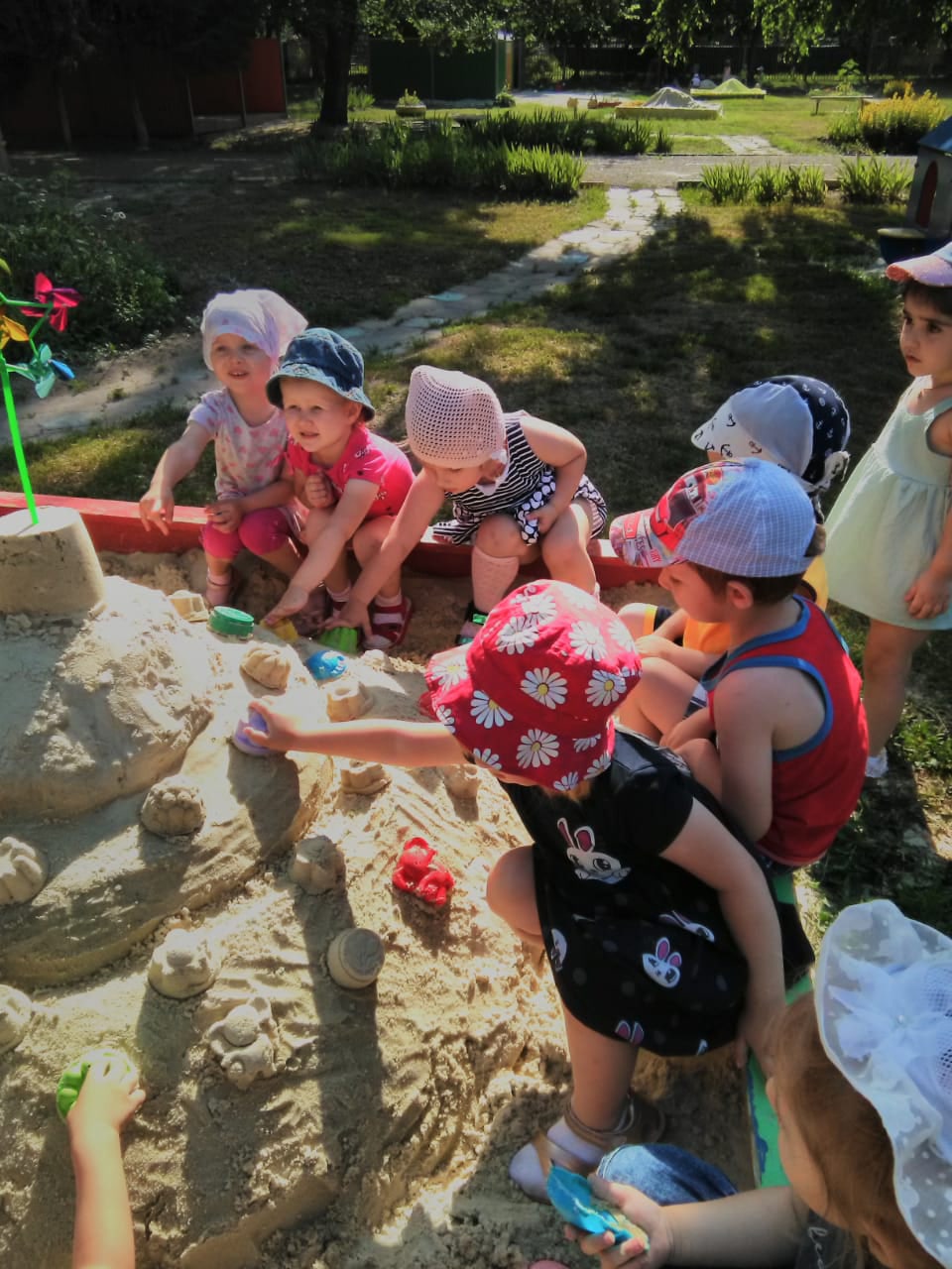 Лето-прекрасная пора для полноценного развития детей. Столько возможностей кругом: вода, трава, цветы, песок. Наверное самый любимый материал летнего периода у всех детей — это песок. В этом убедились сегодня наши малыши.